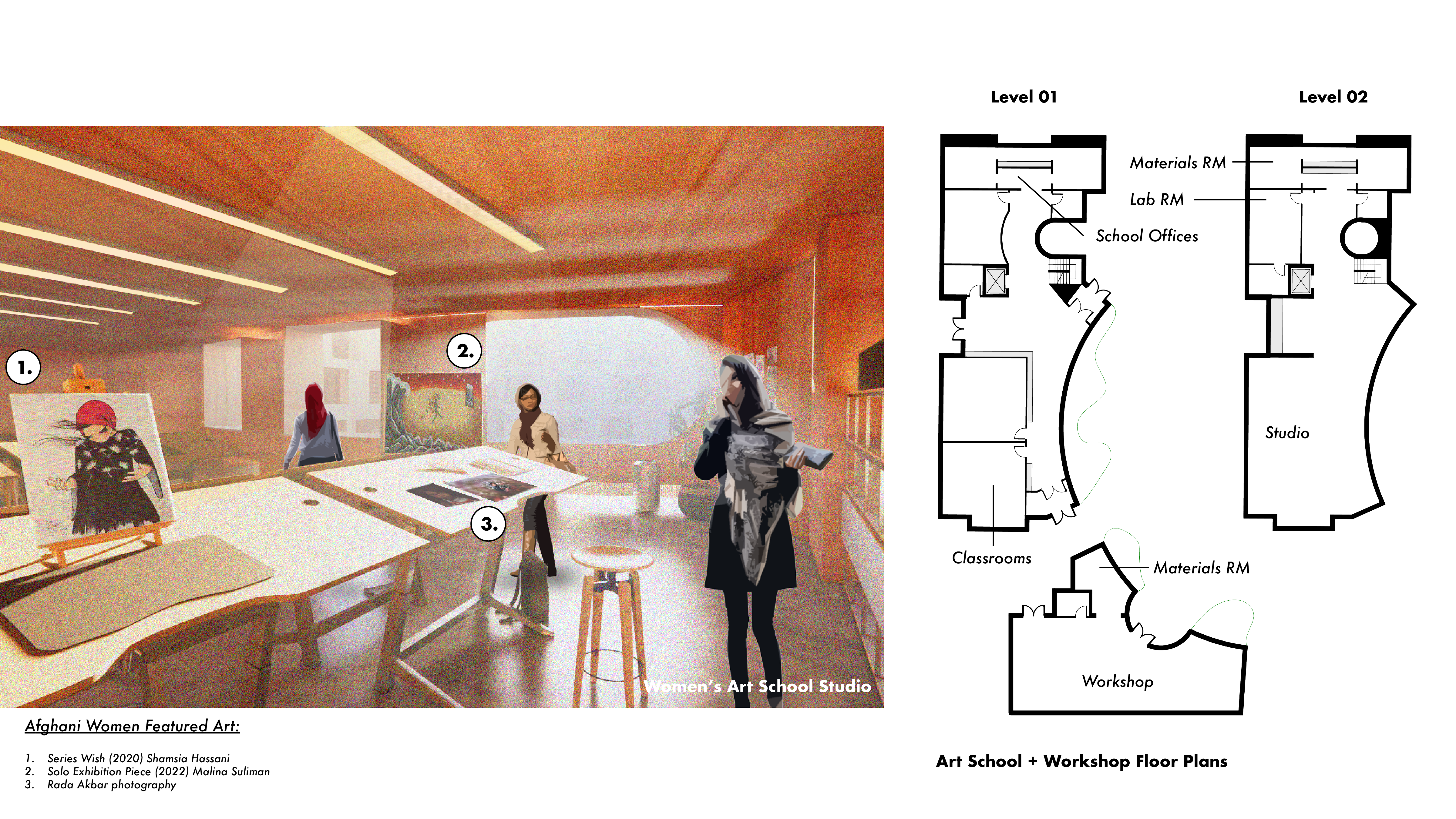 The structure will take upon natural Afghan typologies such as carved spaces resembling the void where the Buddhist statues once stood, rammed earth, and carefully designed landscapes. The recreational campus and a sculpture garden attend to the surrounding women-focused areas to help promote their essential voice in the community.