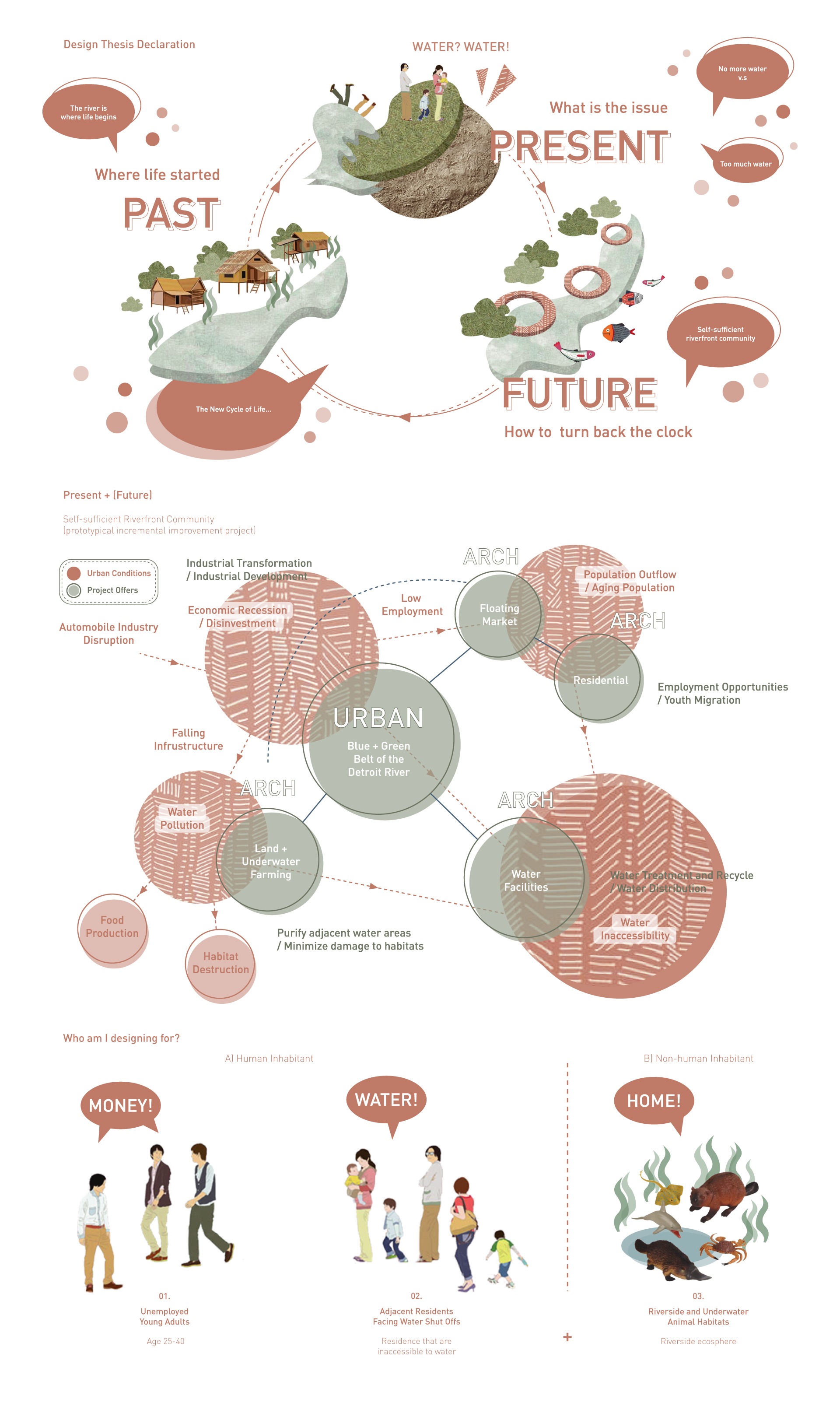 Life begins in the river. For centuries, people inhabited the fluid shorelands and relied on water for their livelihood. As the river and land were gradually urbanized, they became fixed, competing categories demarcated by hard boundaries. Once experiential, water turned quantifiable: too much or too little (flooding/drought). Never ok if unexpected. With the changing climate, those variable conditions are becoming more permanent and acute. In the next decades, more intense precipitation will turn land into wetness, disrupting local populations. This project aims to propose a self-sufficient amphibious riverfront community in 2050 to adapt to live with water thus creating a new cycle of life.