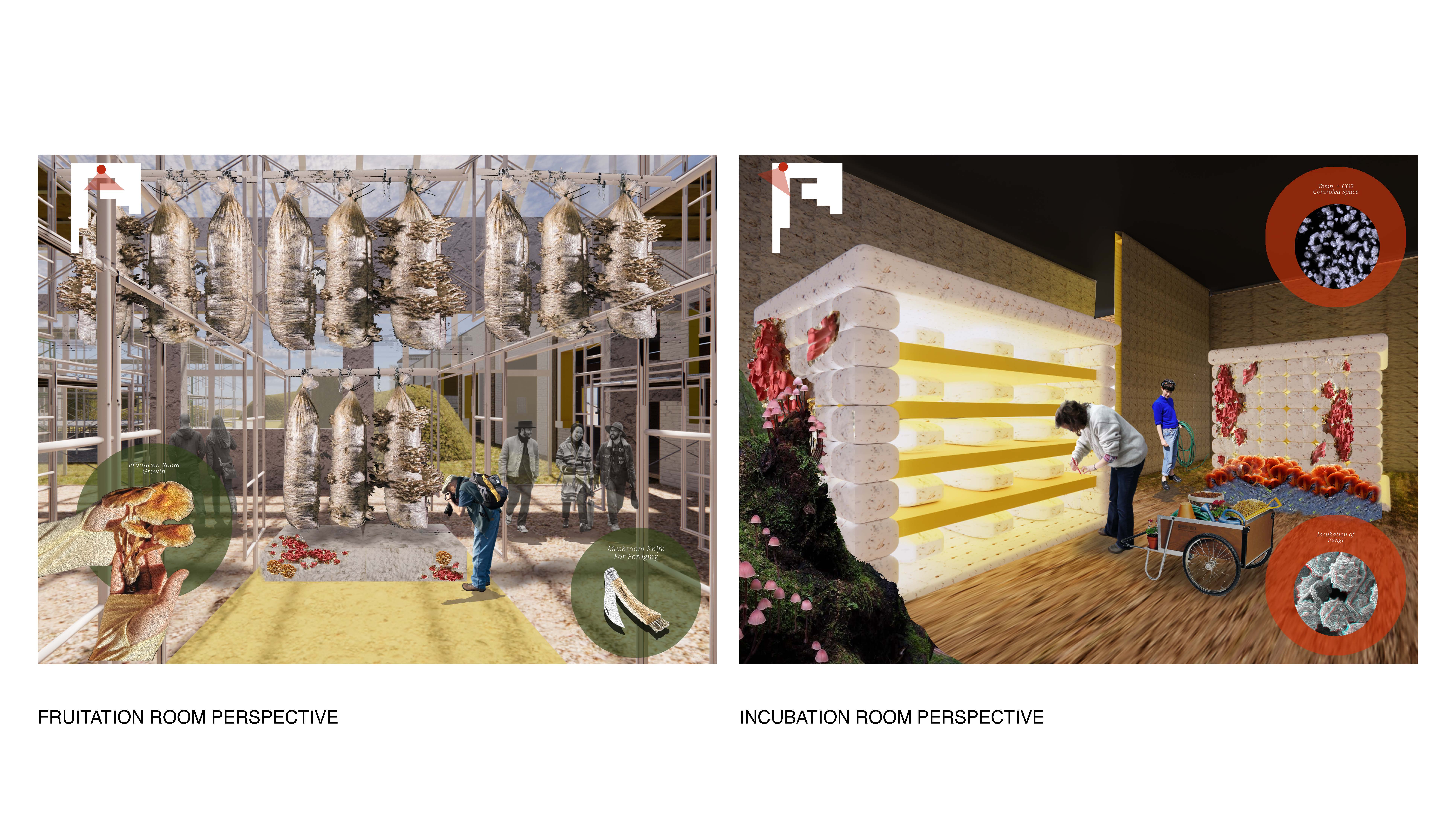 Fungarium Grounds is an interim program that offers community engagement to Ann Arbor, Michigan, and surrounding cities. It brings knowledge about sustainable materials, education about foraging for all ages, and involvement in making a future impact using fungi as a valuable material. This central hub to mycelium merges its connection to people, specifically through construction materials like brick and insulation, and the development of this material through all phases. This site expands Ann Arbor's relationship to fungi through moments of exchange, display, and production activities.