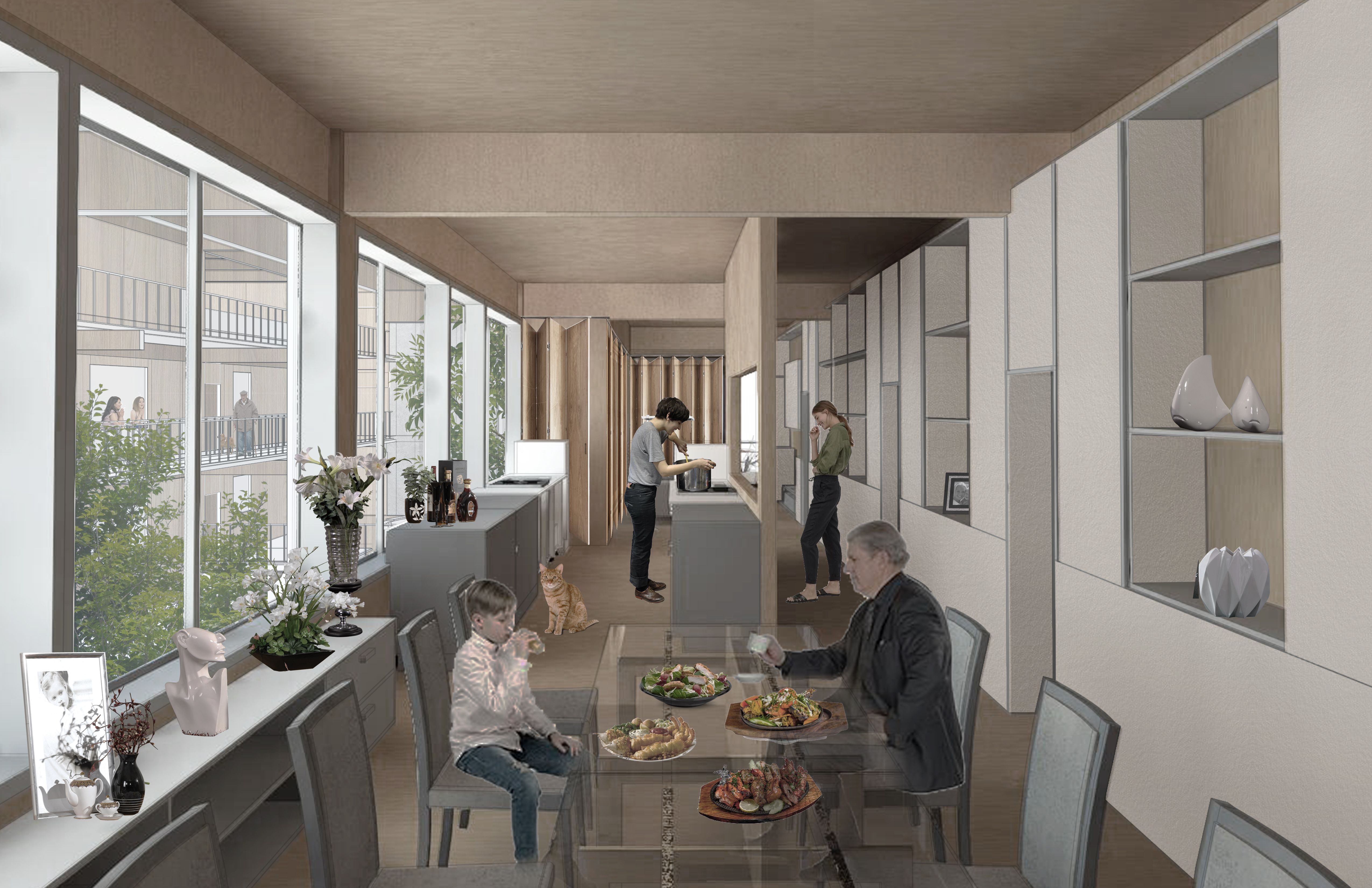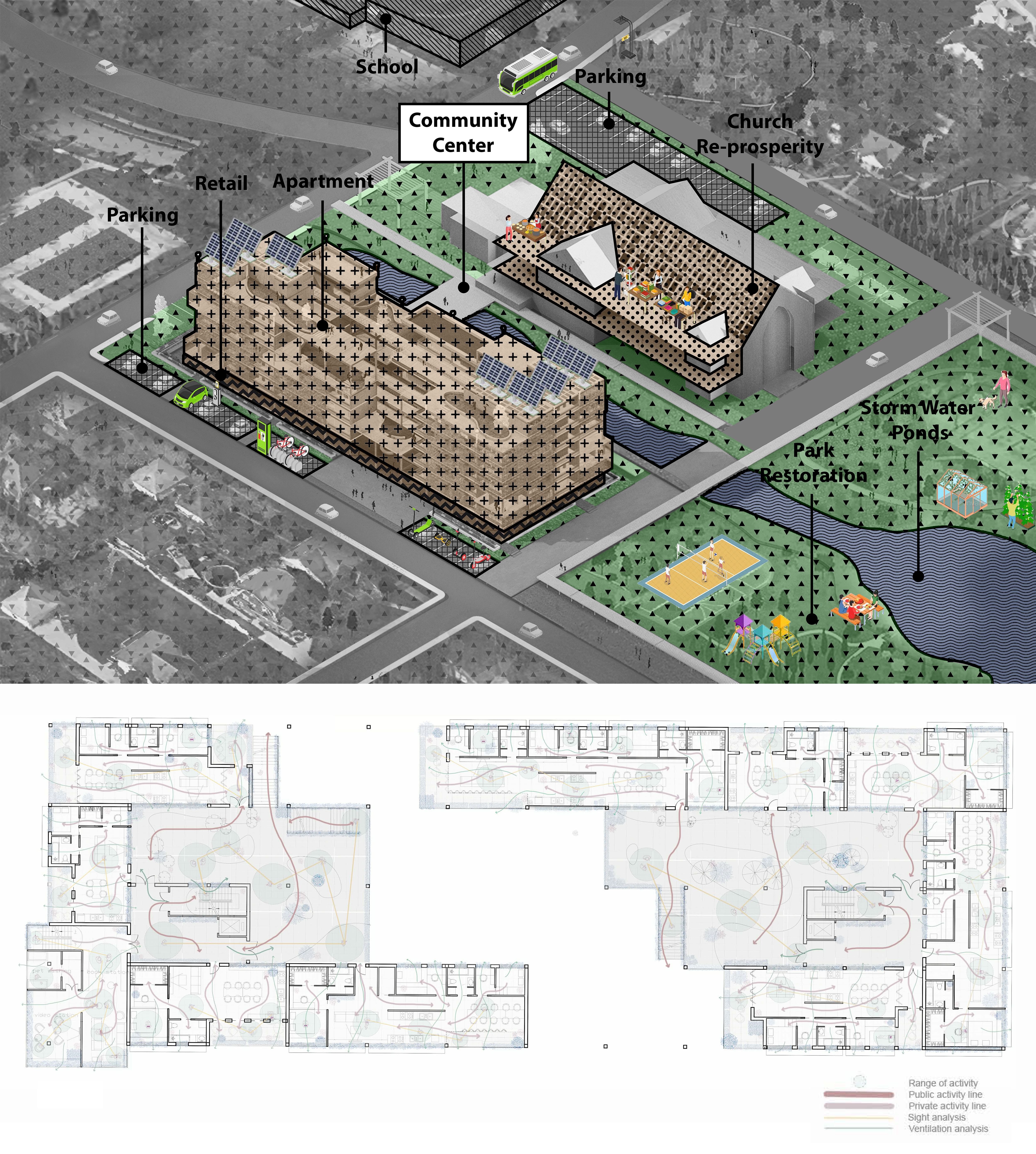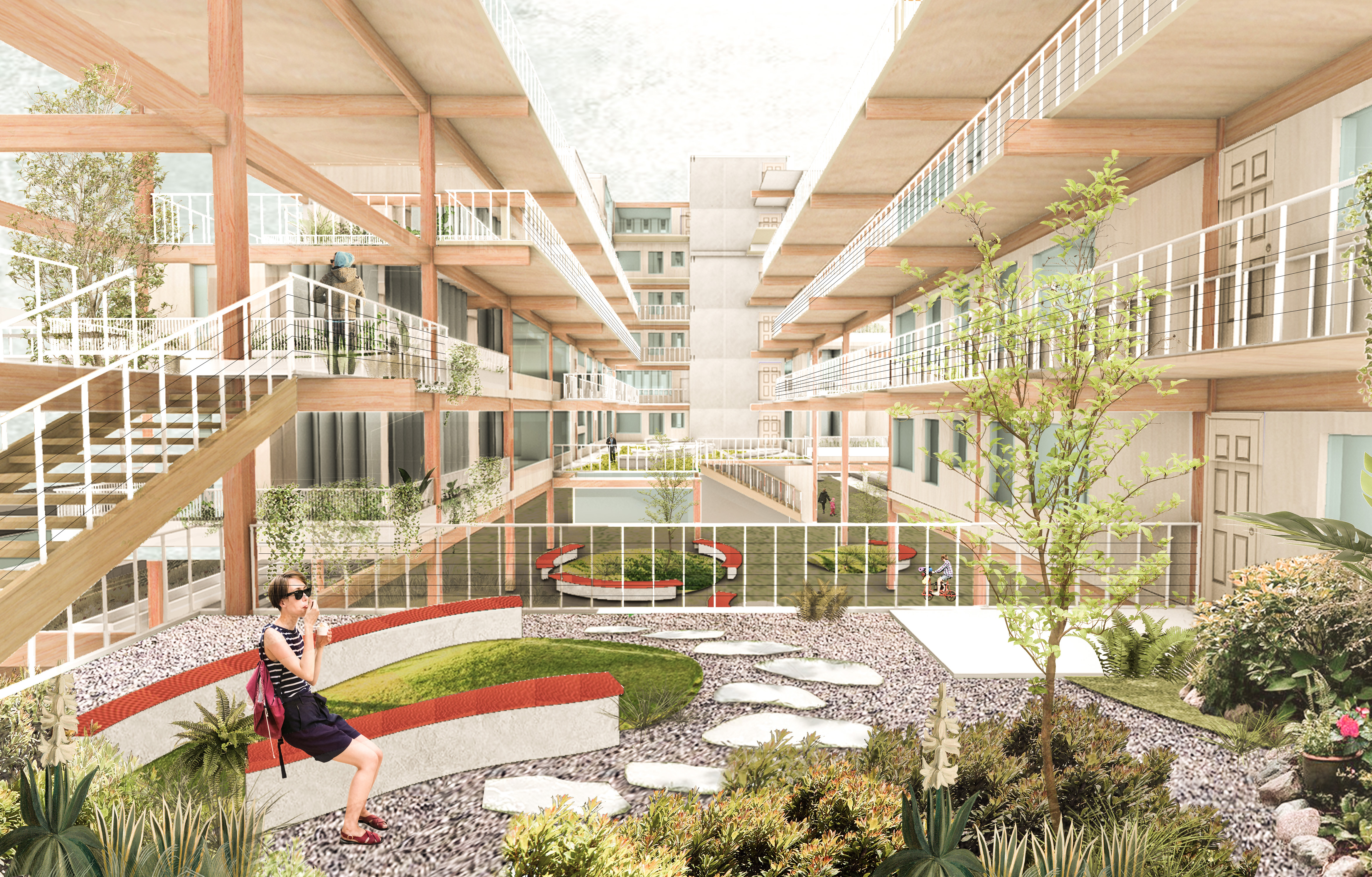 To spatialize our proposals, we mainly develop through: -an environment-friendly natural self-adaptive diverse landscape and installations-economical modular CLT resident units with flowing public spaces and gardens-economic passive facade design cooperates with solar panels and under tanks to achieve an energy-collection system.
