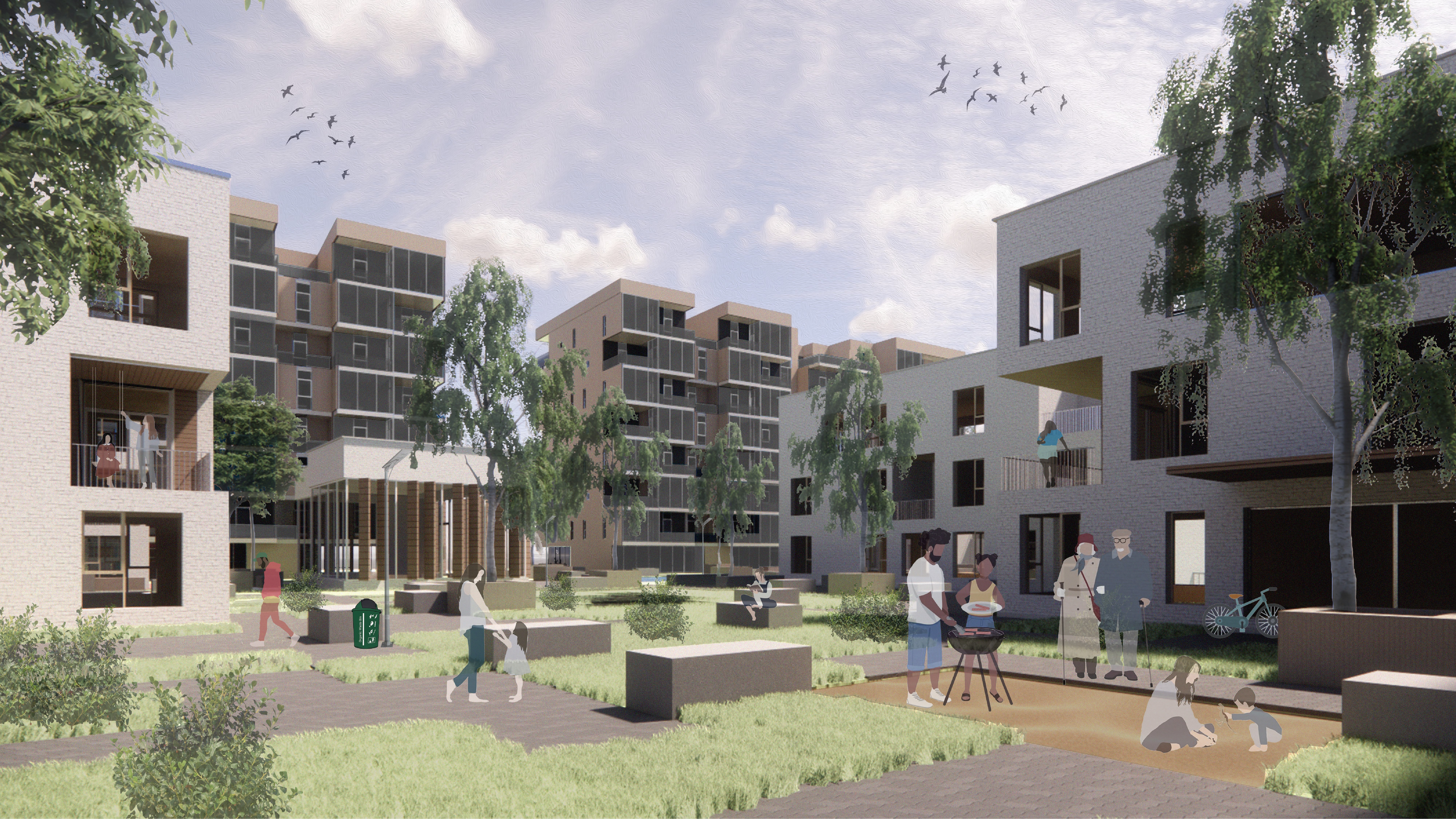 Eco social is a fusion of experiences that defines ECOlogy and ECOnomic viability within a housing project. Situated in the context of Brush Park, Detroit, the site is surrounded by a lot of historical significance and new developments, this community tries to give importance to the social context and the multigenerational demographics of the area. It talks about socialization as a key element mainly to give importance to the mental health of the people and their wellbeing and also make the different ages group and diversity of people feel inclusive in the space. It is seen at different scales in the project starting from the pedestrian walkways, to co-living spaces and unit level design in multiplex and highrise.