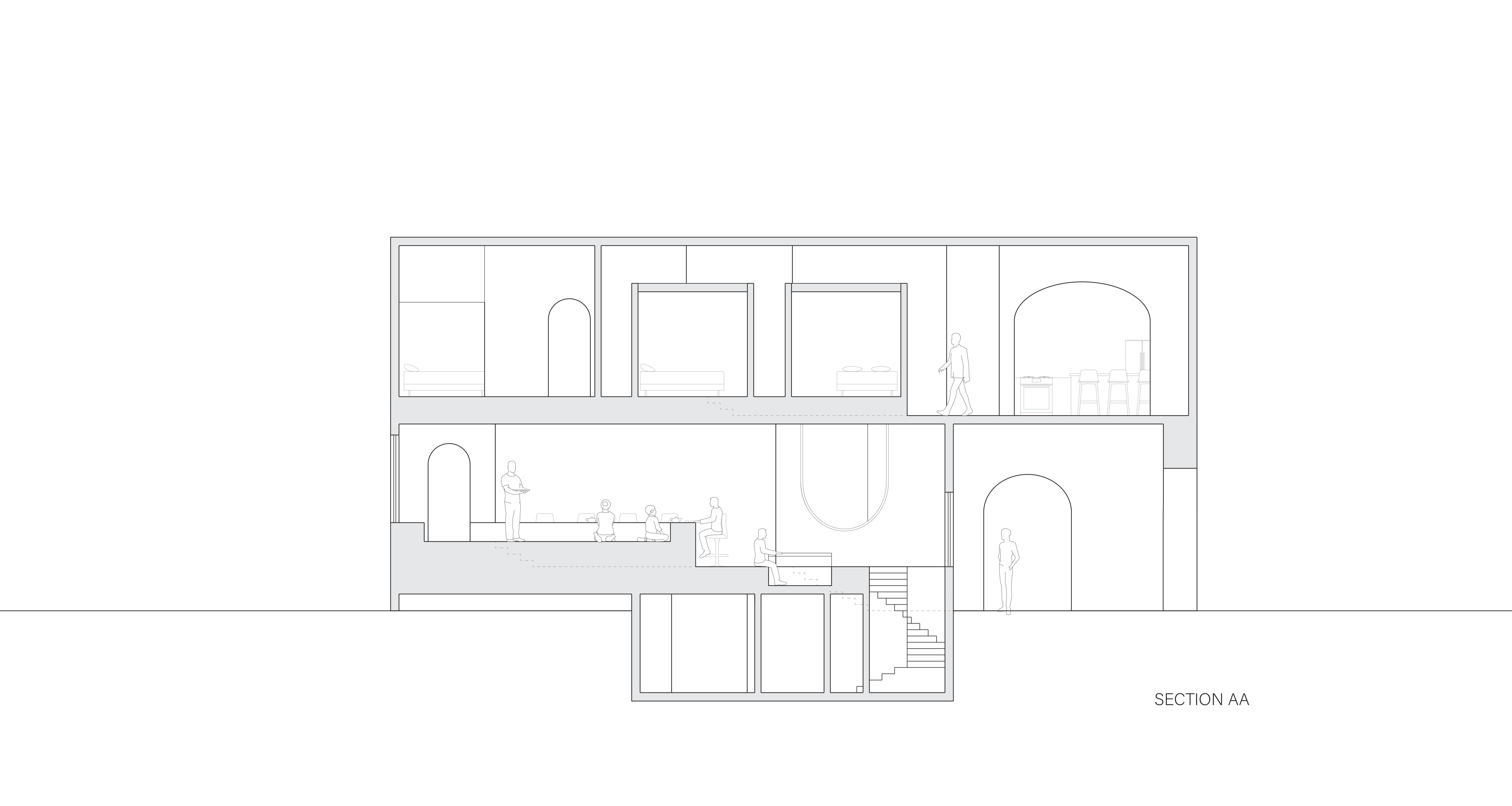 The Tea Vault is a combined storefront and home, a tea cafe on the street level and living quarters for the owners of the cafe on the upper level. This building explores formal and experiential consequences of the vault geometry and floor elevation changes in tandem. Using vaults in plan allows for a nuanced notion of solid and void, while also creating moments of privacy without explicit obstructions in path or sight. The cafe and house are programmatically organized in parallel, exploring how aspects of living are translated into aspects of a tea house.