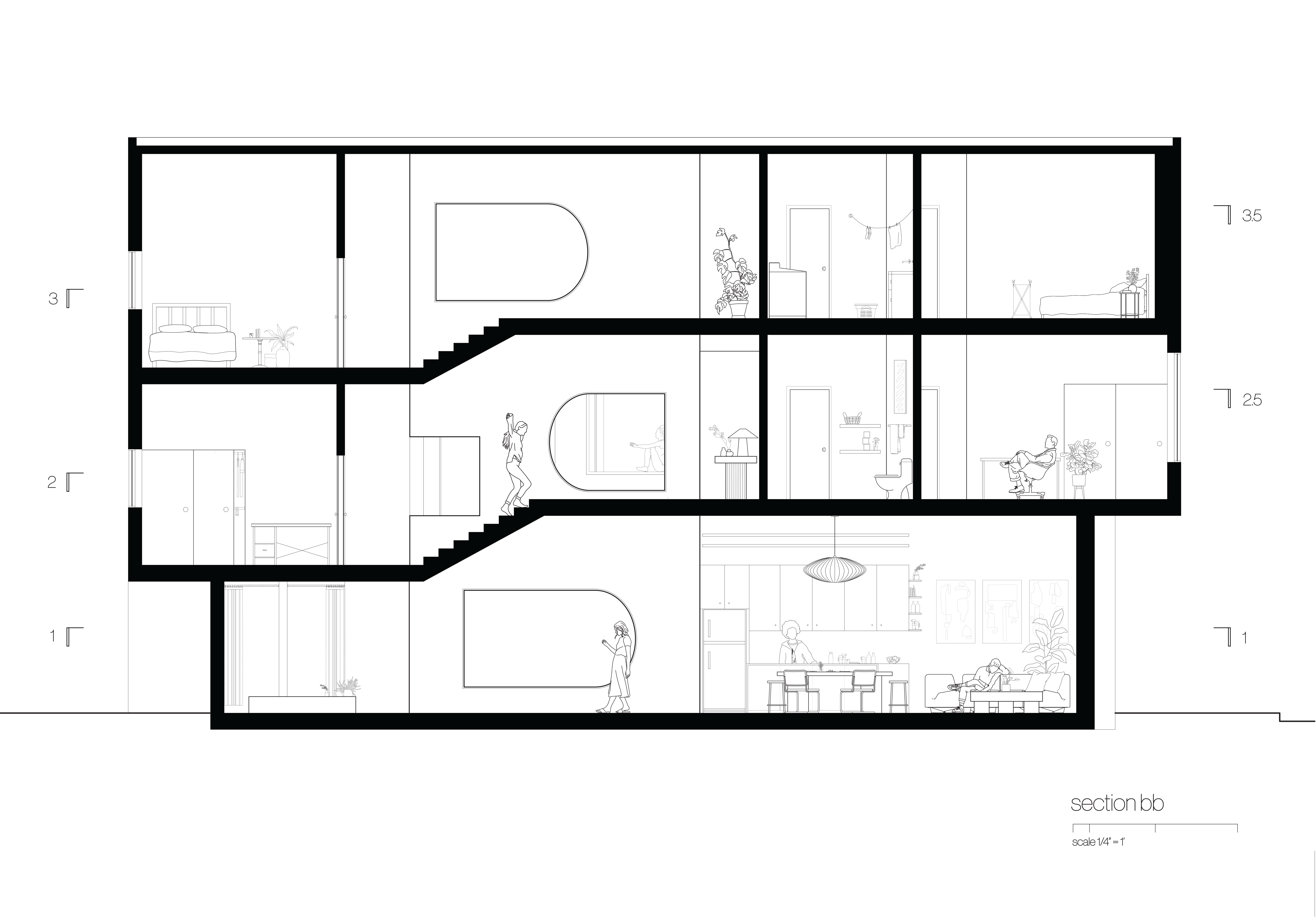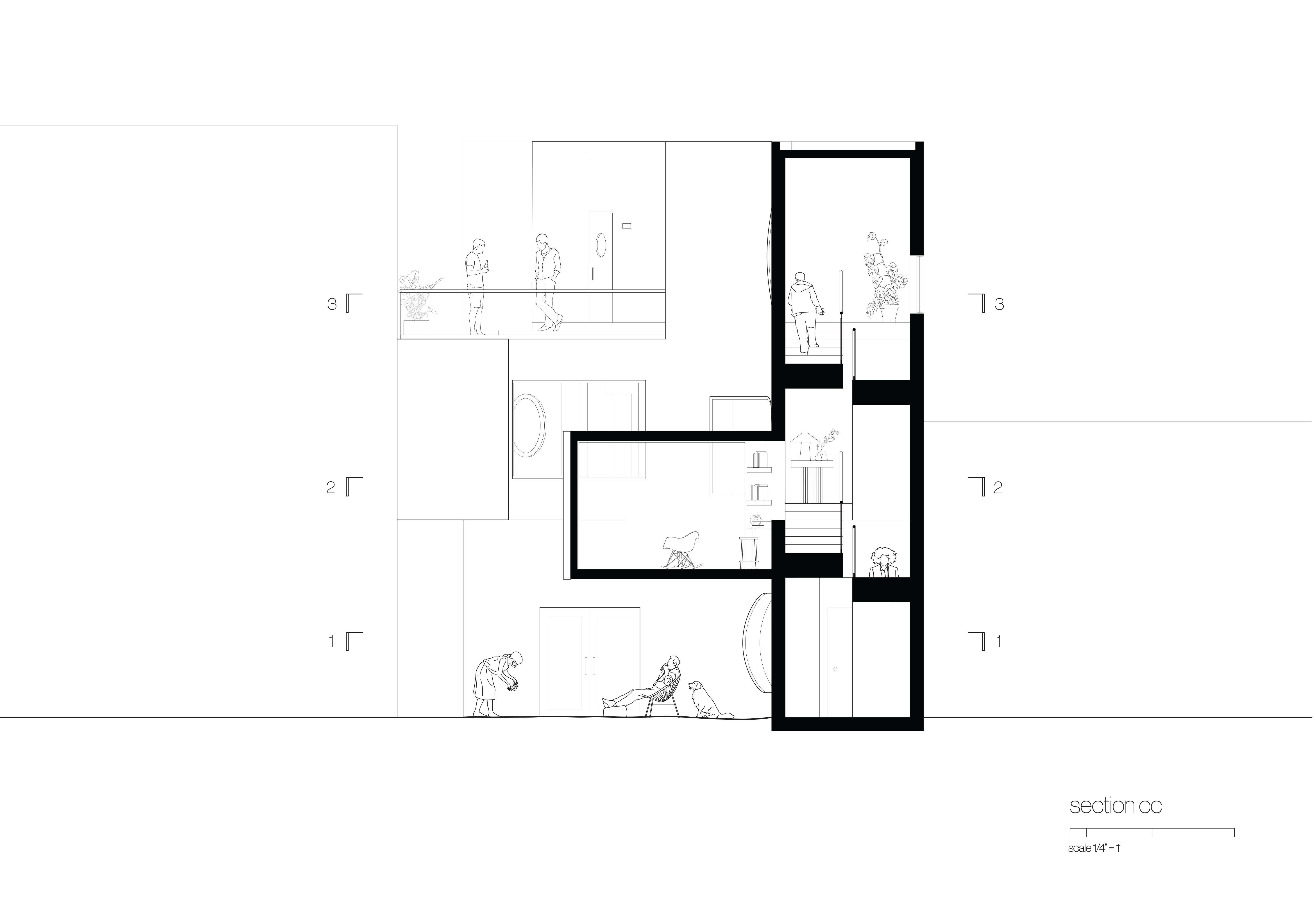 This cooperative house uses sight as a way to prompt spontaneous conversation among its eight house members. Designed in conversation with Johnston Marklee’s Vault House, but for a reimagined program and mid-density urban site in northern North America, this co-op adopts the language of a vista as a tool to draw inhabitants towards the frame’s subject. While Vault House prioritizes a singular exterior vista that creates a unique relationship between inhabitants and site, this project imagines bringing the vista to the inside—creating opportunities for interactions between fellow housemates.